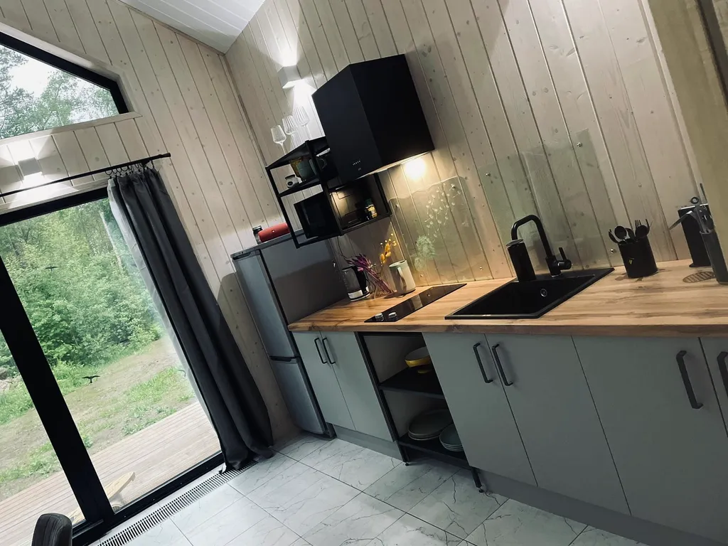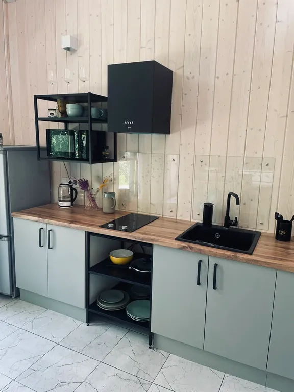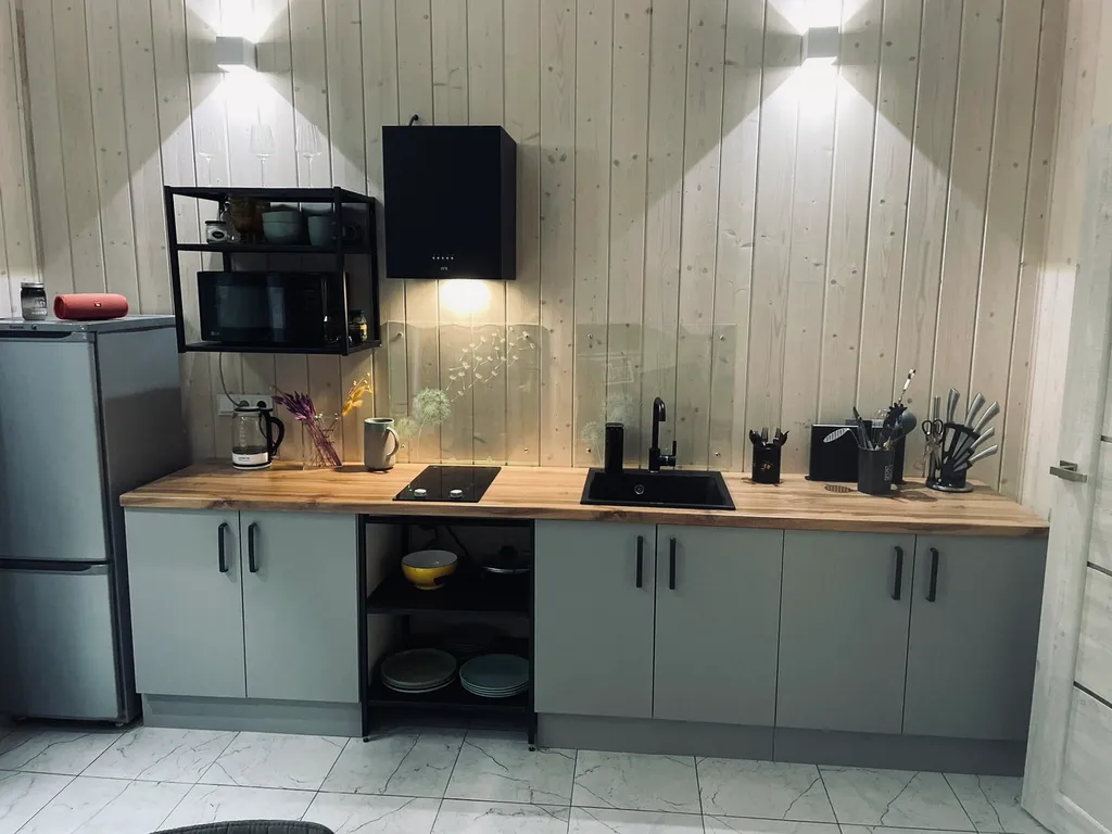 Кухня оснащена всем необходимым: микроволновой печью, холодильником, электрической варочной поверхностью и посудой, чтобы вы могли чувствовать себя как дома, шампура и решетки также имеются (с собой просим захватить только угли и розжиг).