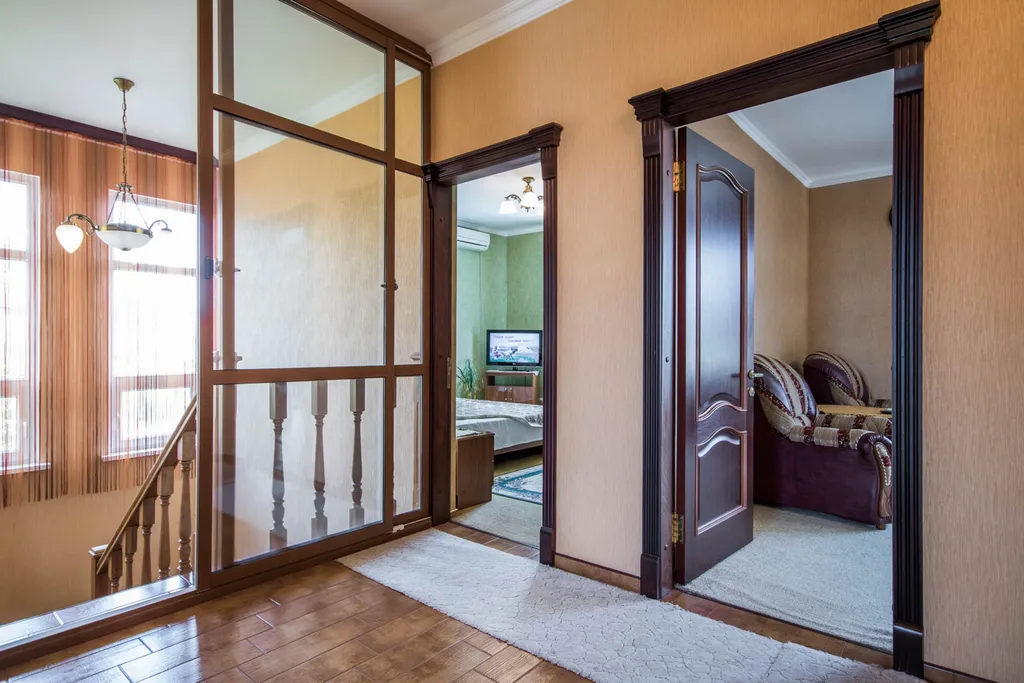 Корпус №1: 5 отдельных спален, 2 санузла и ванные комнаты, светлая гостиная, балкон, кухня, терраса с мебелью.