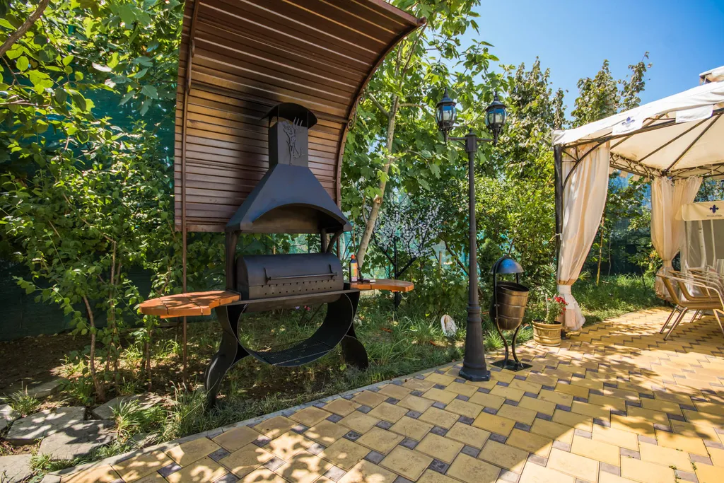 Зона барбекю под навесом – профессиональный мангал, шатер, столы и садовая мебель для застолий на свежем воздухе.