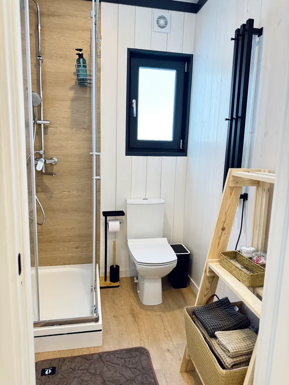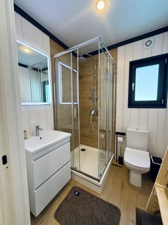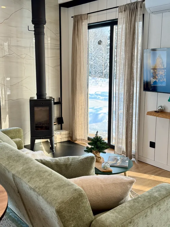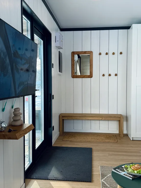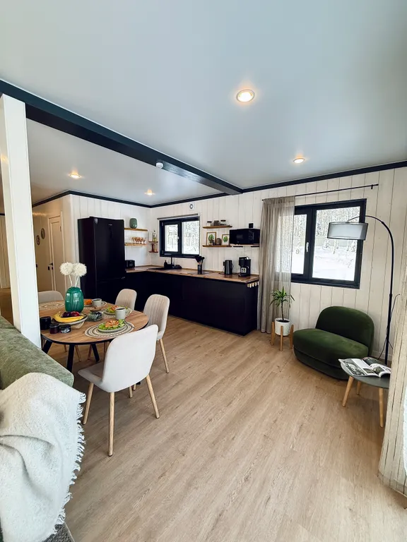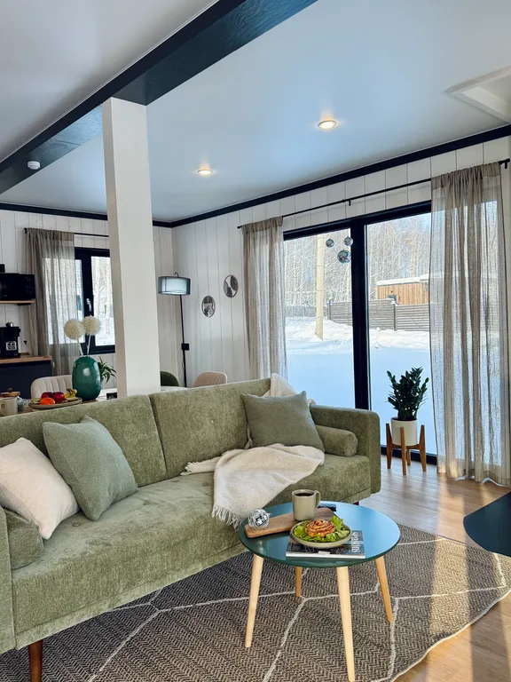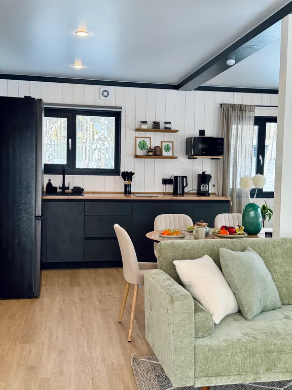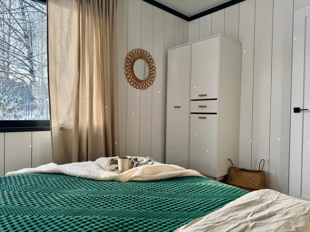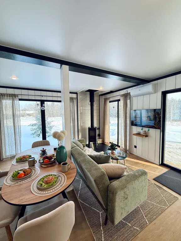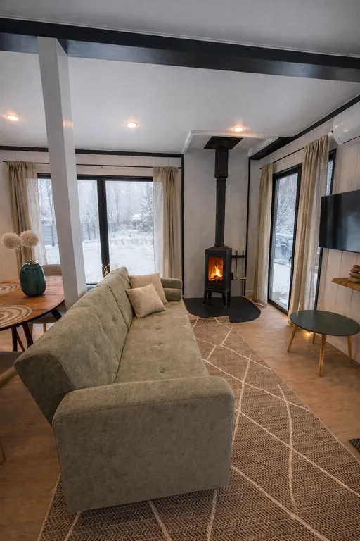 В доме две отдельных спальни с двуспальными кроватями, просторная кухня-гостиная с раскладным диваном на одного и камином. Панорамные окна дома выходят на лес и озеро.