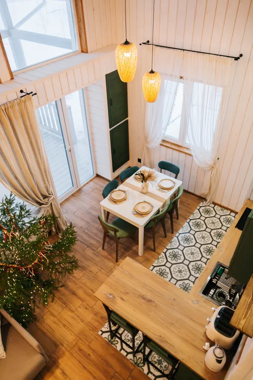 Уютная гостиная-столовая с мягким диваном располагает к долгим вечерам, играм, разговорам и совместным приготовлениям ужина. Здесь время замедляется, а разговоры становятся глубже.