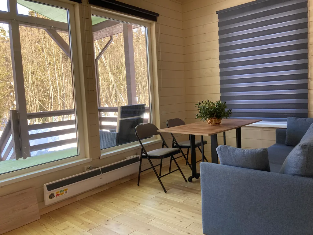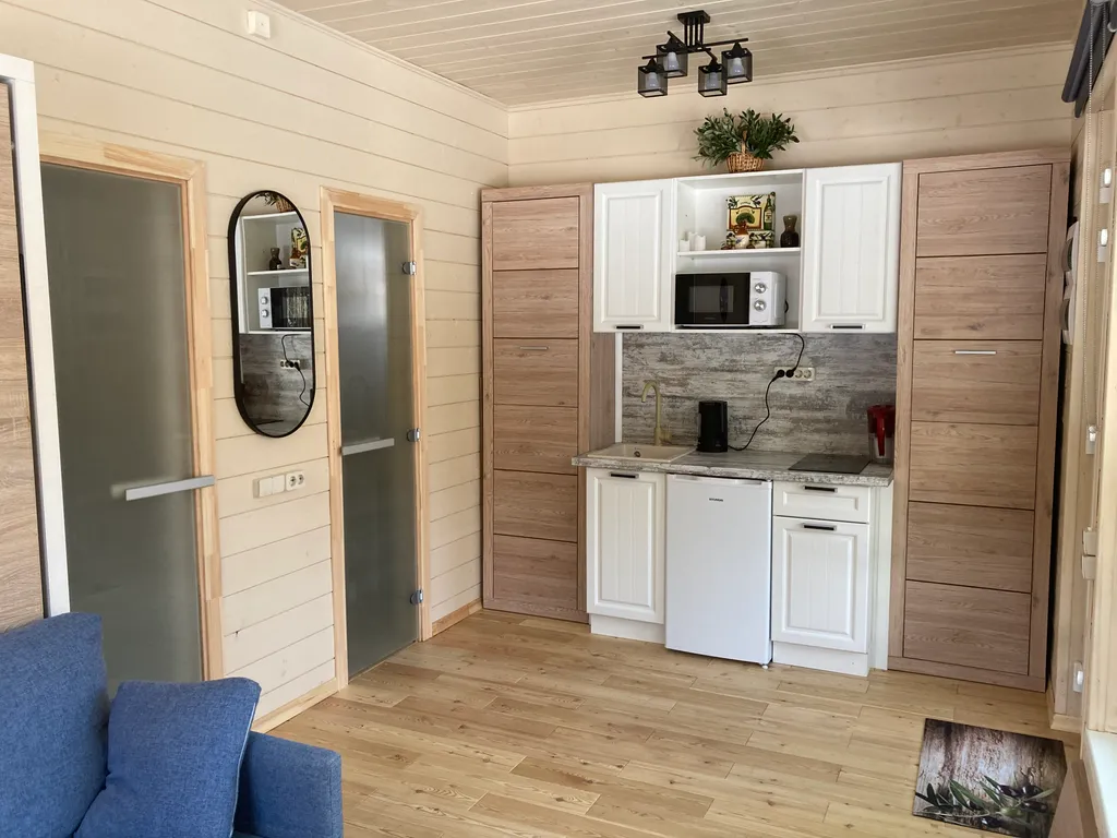 Внутри домика вас ждёт большая удобная кровать-трансформер (180см шириной), кухня со всем необходимым для приготовления блюд, ванная комната с видом на лес, и собственная сауна (пользование сауной включено в стоимость проживания)!