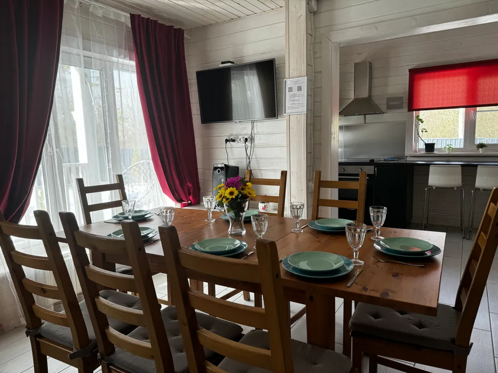 - уютная и просторная гостиная с диваном, телевизором, муз. Колонкой и большим столом.